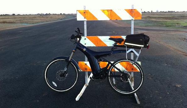 With the time change just around the corner I will be riding home in the dark each night from work. There is a new road being built that may soon be part of my ride home as it cuts through an area of my commute and provides a better path for me to make the journey. Here is a picture of my Optibike at the new entrance to it. You might notice the new light-up spoke reflectors I?ve added to the bike.