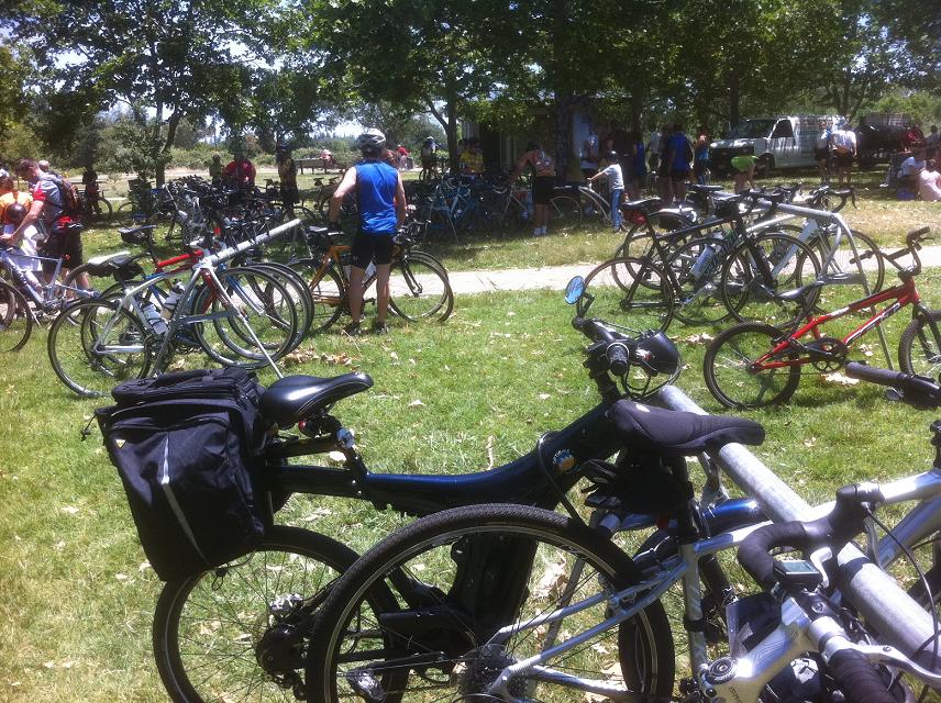 When I came back we were able to enjoy a great lunch BBQ. I parked my bike in the temporary bike racks we had setup earlier that morning. Here is a picture of my Optibike among dozens of other bikes that had already returned from the ride.