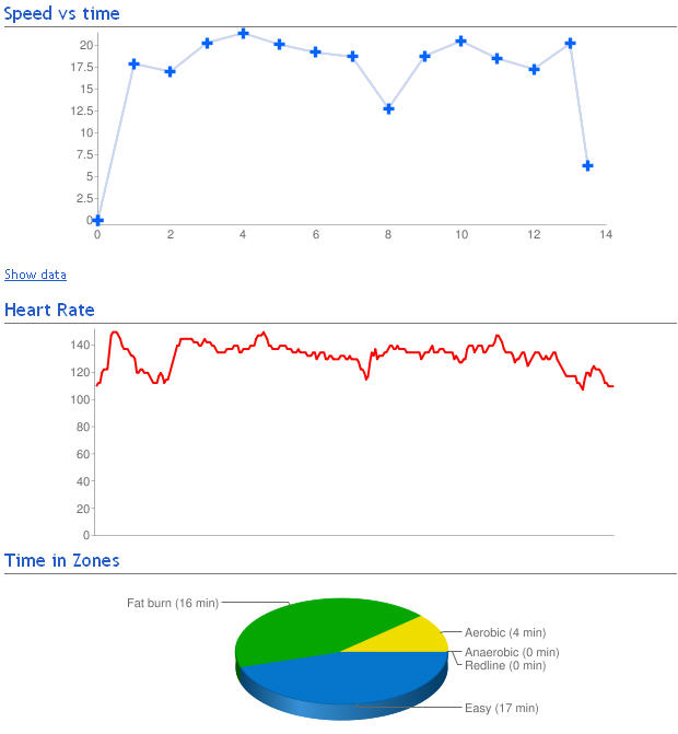 I?m currently testing out the iPhone software program called ?Log Your Run? on it. This software logs my speed, time, my location (including elevation) on a map, and my heart rate readings. Here is a sample of my ride home earlier today after I saved the results online and brought up the graphs.