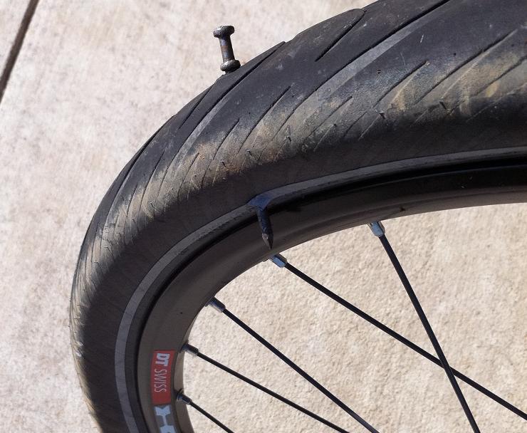 A nice little 2.75 inch double-headed nail went straight through the tire and pierced the tube as well in 2 places. Who would have figured? In trying to find the positive side of things: At least it didn?t damage the rim!